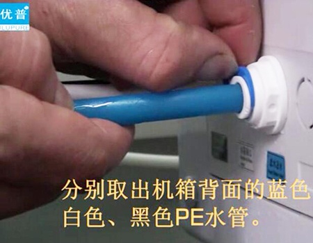 2.分別取出機箱背面的藍色、白色、黑色PE水管(取下藍色卡環,按住卡爪,將水管輕輕向外拉)。