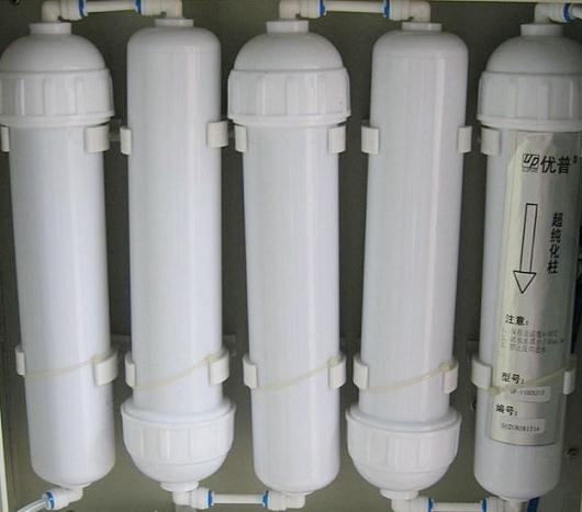 (2)純化柱:純化柱也叫超純化柱,作用是對反滲透純水進(jìn)行深度脫鹽,原理是離子交換。純化柱的壽命由電阻率在線來表現(xiàn),非常直觀,當(dāng)?shù)陀谀硞€特定的電阻即表示純化柱過期,需要進(jìn)行更換。