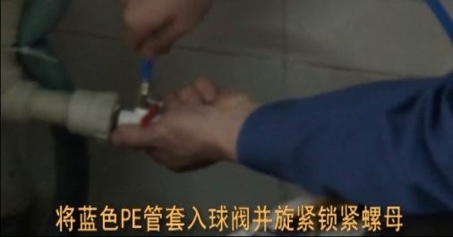 3.取下進水球閥上的鎖緊螺母,套在藍色PE管上,將藍色PE管套入球閥并旋緊鎖緊螺母。