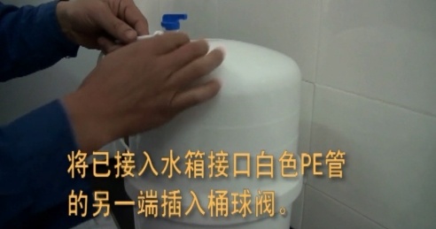 5.拿下水箱頂部藍色蓋帽,在螺紋處纏生料帶5圈,旋入桶球閥,用手直接擰緊,注意不要用力過大。將已經接入水箱接口的白色PE管的另一端插入水箱頂部的桶球閥,然后嵌入卡環 。
