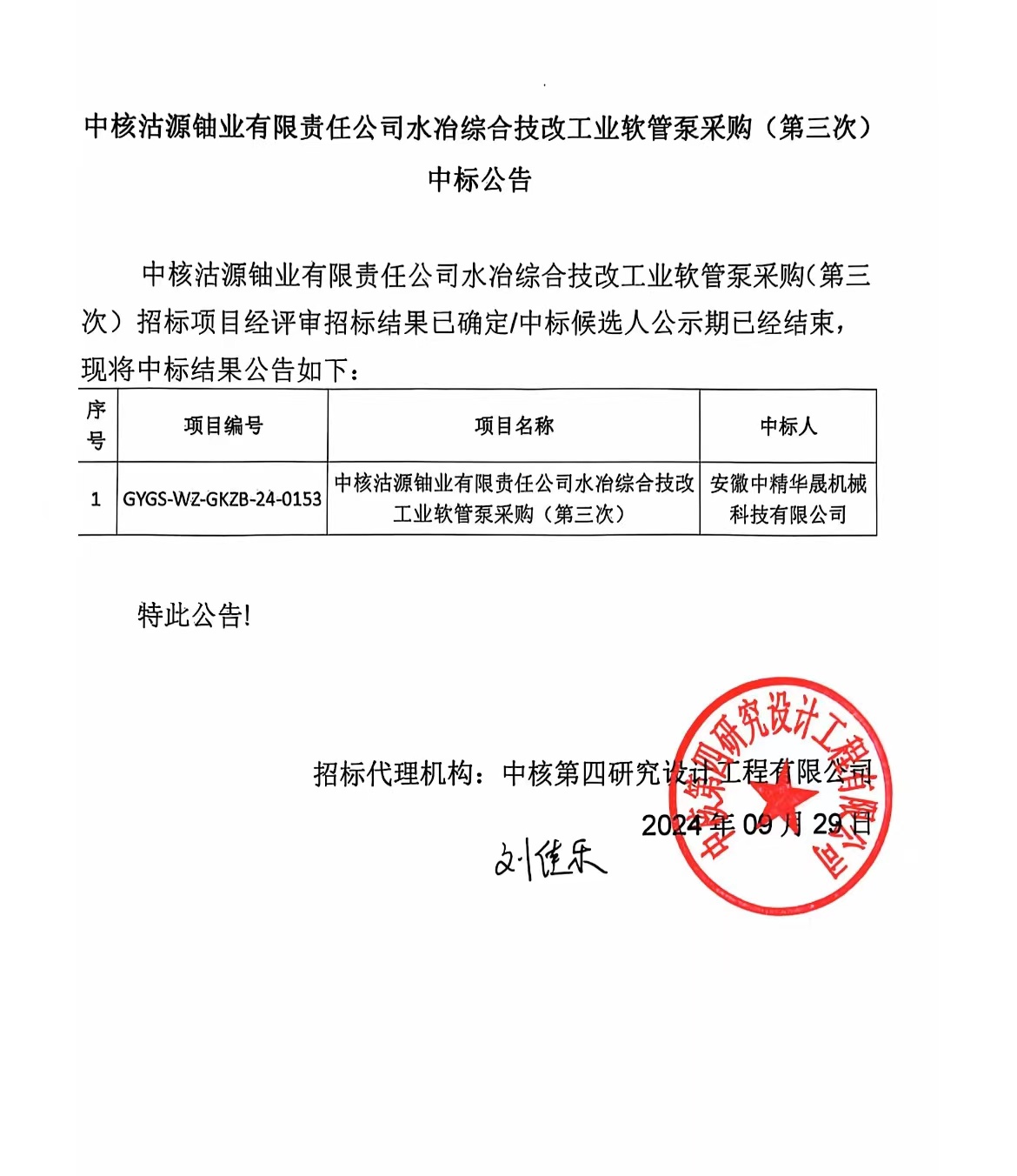 大家好!非常高興地向大家宣布,我司于2024年9月29日成功中標了中核沽源鈾業有限責任公司水冶綜合技改工業軟管泵采購(第三次)項目。首先,我要向所有參與項目投標的同事們表示熱烈的祝賀和衷心的感謝,是你們的辛勤付出、智慧和團結精神,才使我們在激烈的競爭中脫穎而出,成功中標了這個重要項目。對于我司的發展具有重要的意義。中標該項目不僅能夠增強我司在市場的競爭力,提升品牌形象,而且能夠帶動相關產業的發展促進整個行業的進步。